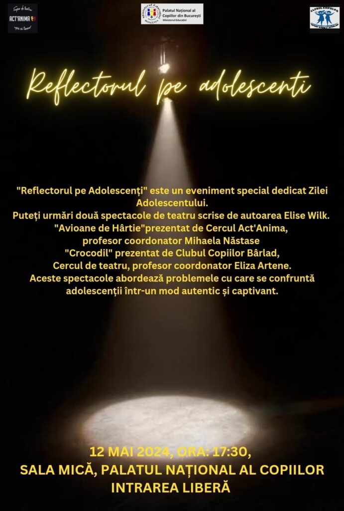 Ziua de 12 mai 2024 este una importantă pentru adolescenţi şi pentru teatru. Iată de ce, cele două coordonatoare de cercuri, Eliza Artene – Bârlad şi Mihaela Ioana Năstase – Bucureşti – au pus la cale un proiect educaţional, de schimb de experienţă, „Prietenii teatrului”, care va aduce în atenţia publicului problemele adolescenţilor de astăzi, folosind textele scrise de Elise Wilk – tânără autoare de piese pentru adolescenţi, născută la Braşov.